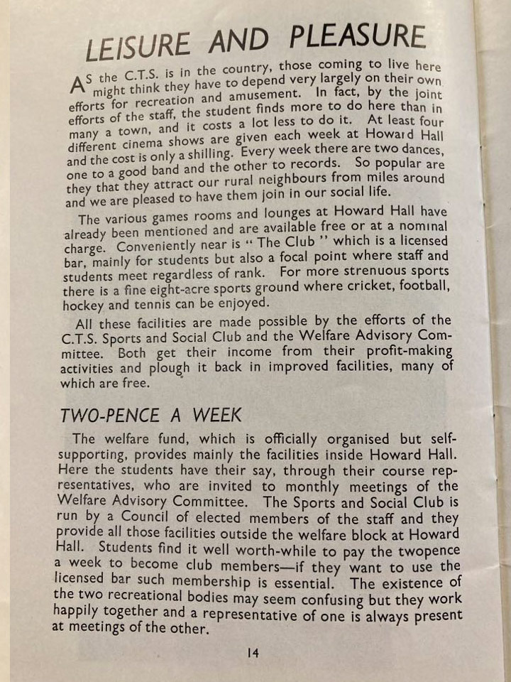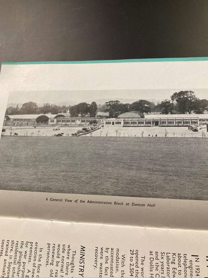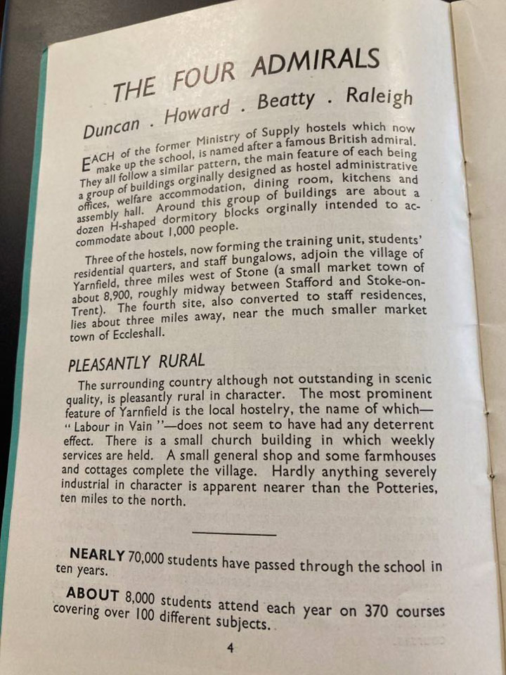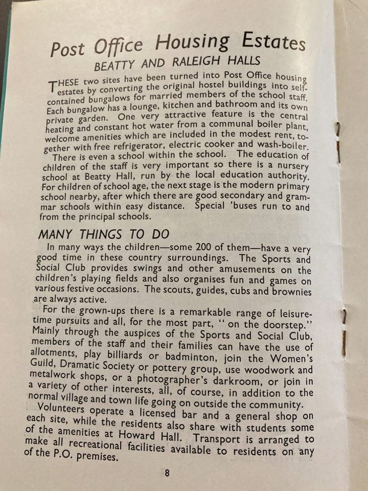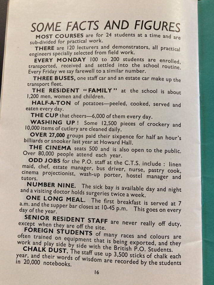 This 1956 booklet, The Post Office Engineering Department’s Central Training School, was published for staff, students, and visitors. It captures a moment in time when the school was already world-famous for its scale and spirit — a community complete with classrooms, workshops, homes, gardens, and a lively social life centred around the four “Admiral” sites: Duncan, Howard, Beatty, and Raleigh Halls.