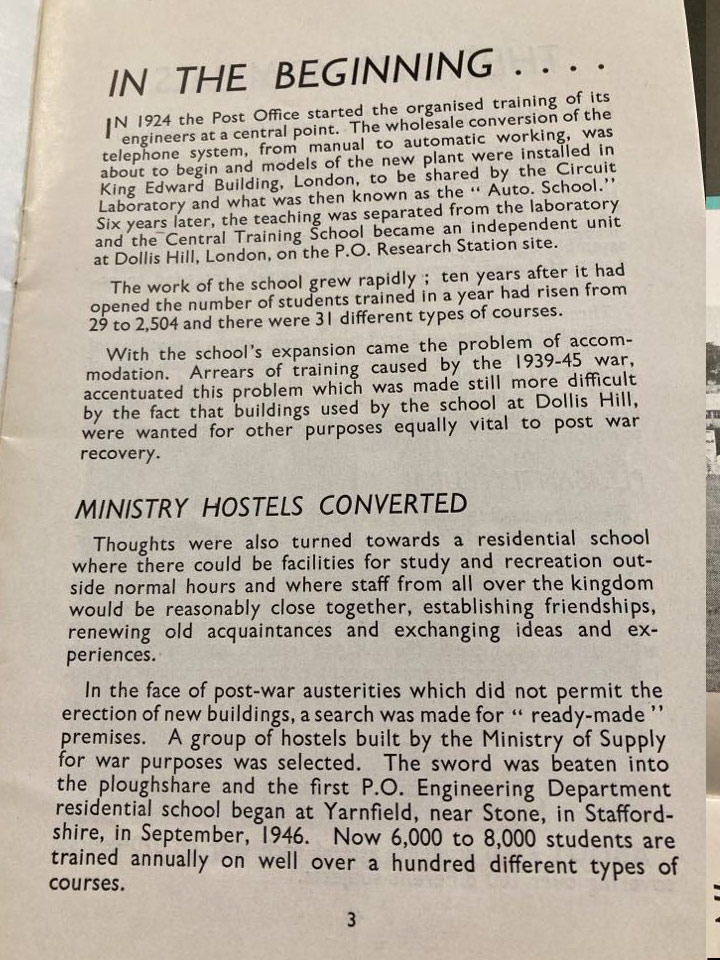 In the years following the Second World War, the General Post Office transformed a group of former Ministry of Supply hostels near Stone, Staffordshire, into a thriving centre of learning. The Central Training School at Yarnfield, officially opened in 1946, became home to thousands of engineers from across Britain and beyond — men and women trained in the fast-changing world of telecommunications.